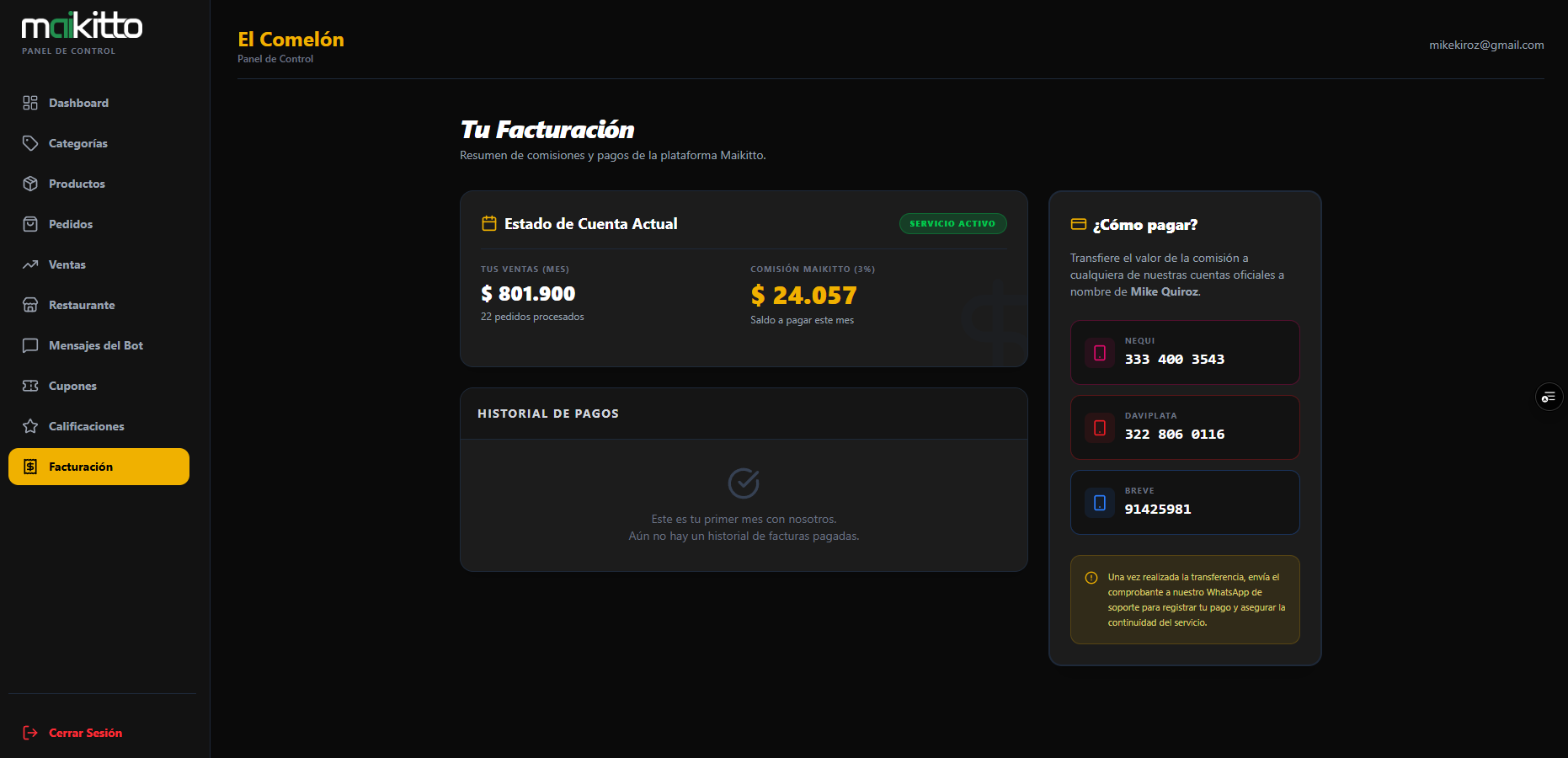 Deja de regalar tu dinero a las apps de delivery. Con Maikitto tienes tu propio canal de ventas por WhatsApp, gestionas tus pedidos y te quedas con el 97% de tus ventas. Solo pagas el 3% cuando vendes por nuestro canal.